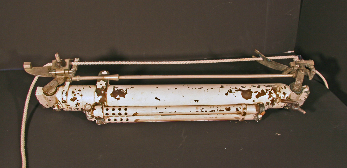 Oisolerande vattenhämtare Nansen, ca 1900. Gåva från Geofysisk Institutt, Bergen, Norge. Mycket använd i hela världen. Med en serie av ett 10-tal instrument gjorde man ett sk Nansen-cast. Kikkranar i båda ändar, som stängs, när hämtaren vänder. På hämtaren fästes en ram innehållande en eller två omvändningstermometrar.