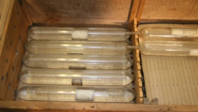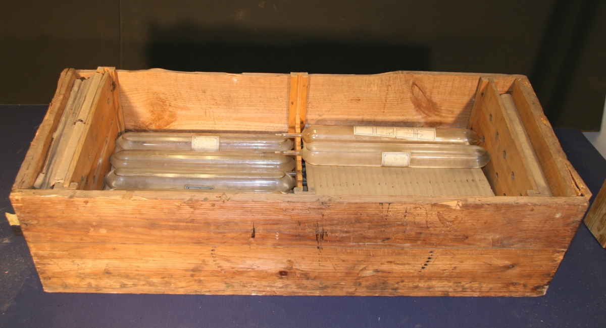 22 glaskolvar med vatten och luftprover placerade i tre lager i specialbyggd trälåda.
