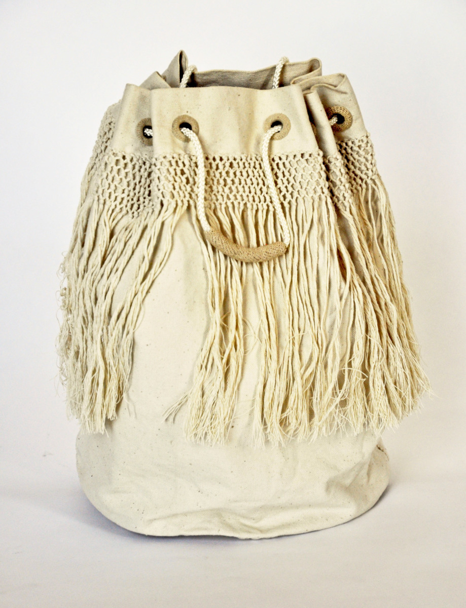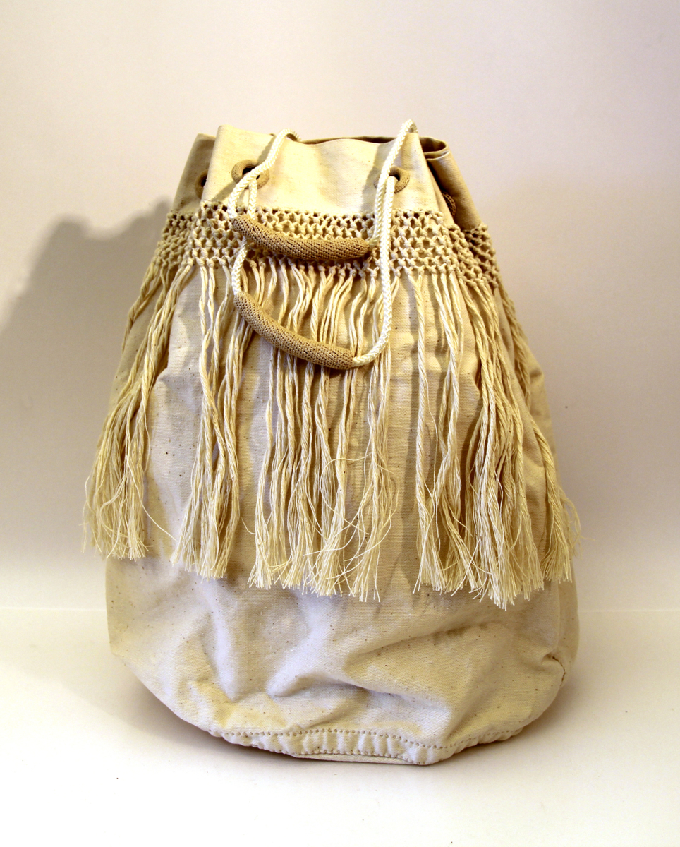 Påse med rund botten. Överkanten är vikt mot utsidan med 5 cm och 23 cm som är repat med 5 cm flätat och resten bildar frans. Överkanten är försedd med hål med klädda kanter med genomdragen lina som drar ihop säcken och är försedd med bärhandtag.