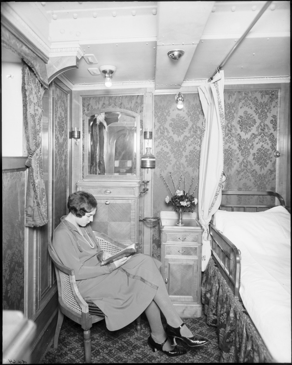 Interiör av första klass hytt med dam som sitter och läser. Hytt för en person.