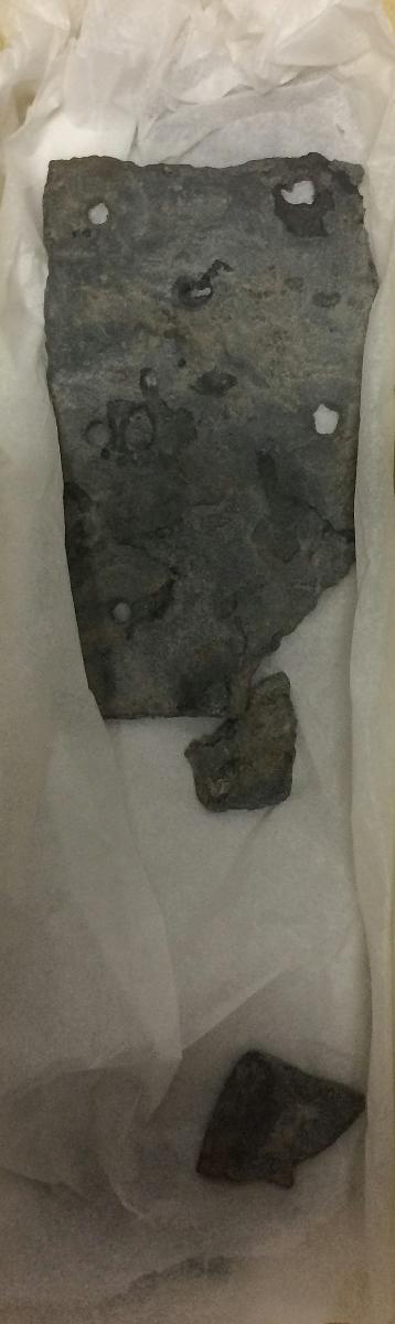 Hål längs kanten. Troligen plåt för lagning eller liknande.