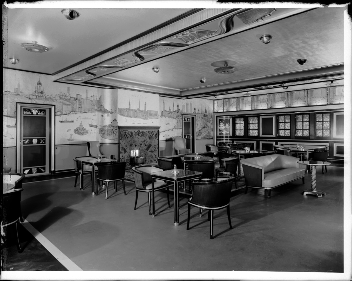 Interiör från första klass rökrum. Väggmålningarna är gjorda av Kurt Jungstedt och föreställer Stockholm och New York. Gjutjärnsspisen är formgiven av Anna Petrus. Beskrivning ur katalog Svenska Amerika Linien, Sverige direkt Amerika: "En djärv färgsymfoni i guld, rött och svart med Kurt Jungstedts väldiga väggmålningar från Stockholm och New York som dominerande element."