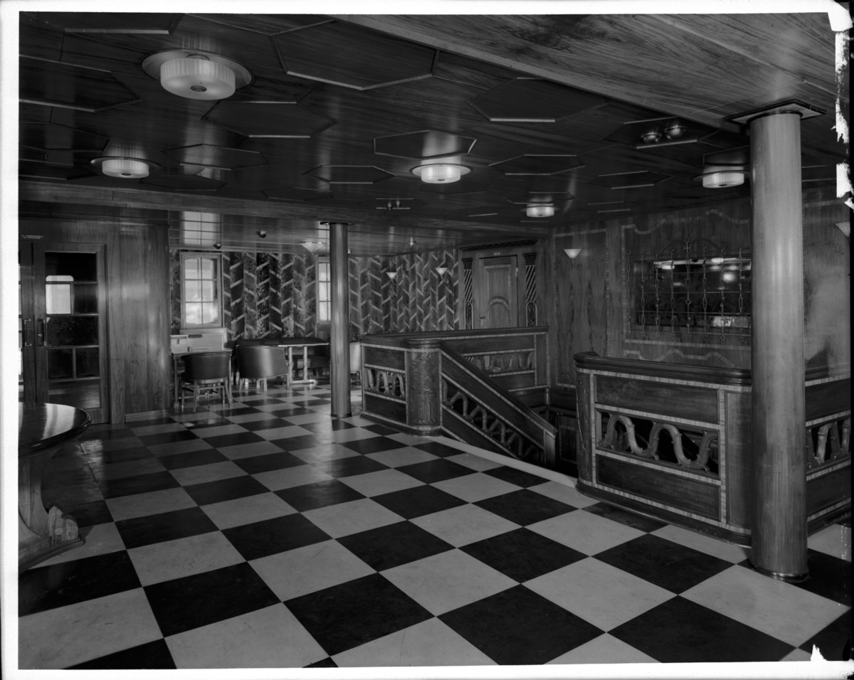 Interiör från trapphallen och vestibul i andra klass. På väggen har man tapetserat med sälskinn.