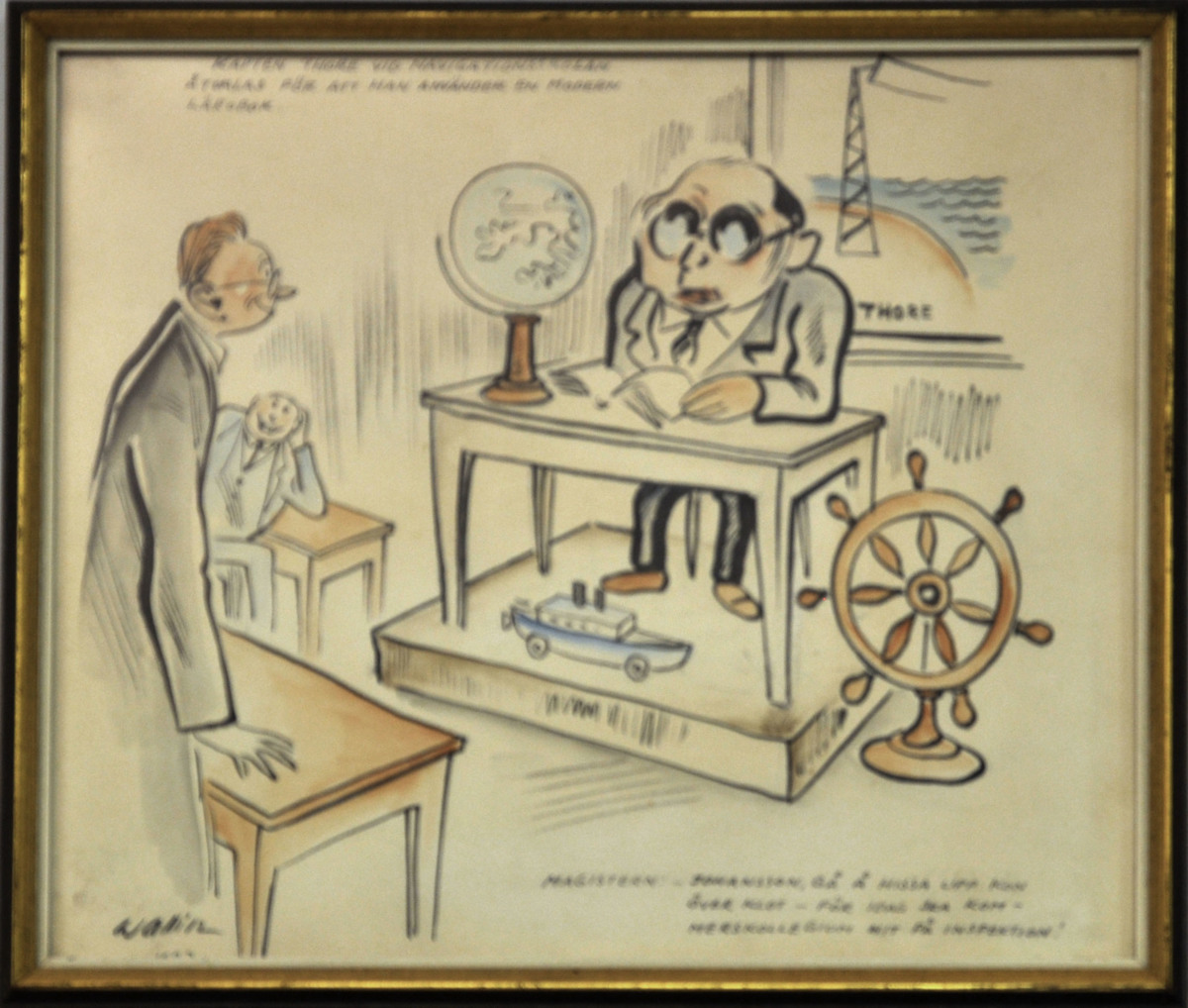 Påskrift: Kapten Thore åtalas för att han använder en modern lärobok. Magistern - Johansson, gå å hissa upp kon över klot för i dag skall kommerskollegium hit på inspektion.