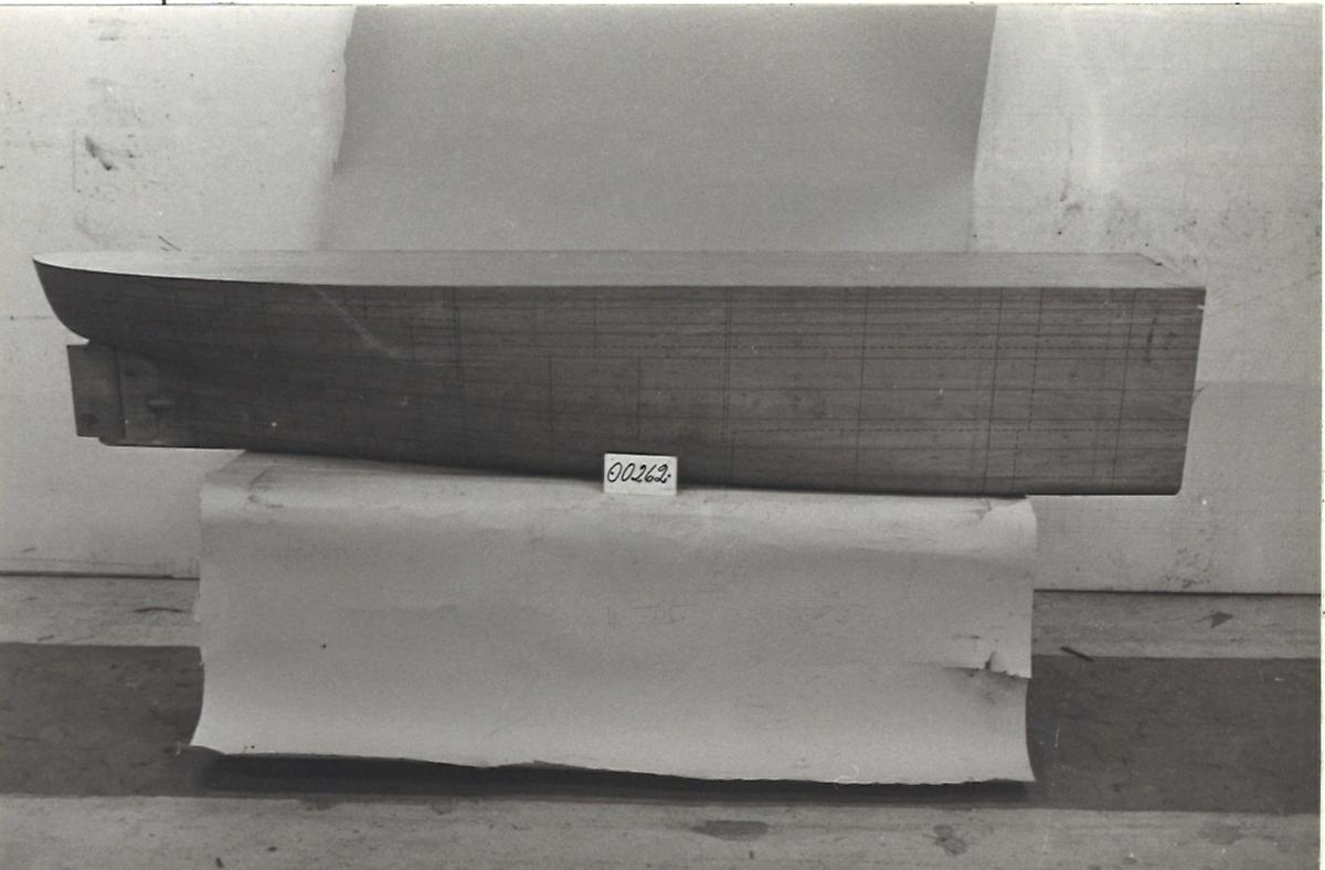 Inplanering & storleksbestämning av bordläggningsplåt samt utslag för olikformade bordläggningsplåtar. Akterskepp: Med plåt- och spantmarkeringar i svart tusch och blyerts. Helt slätt däck.