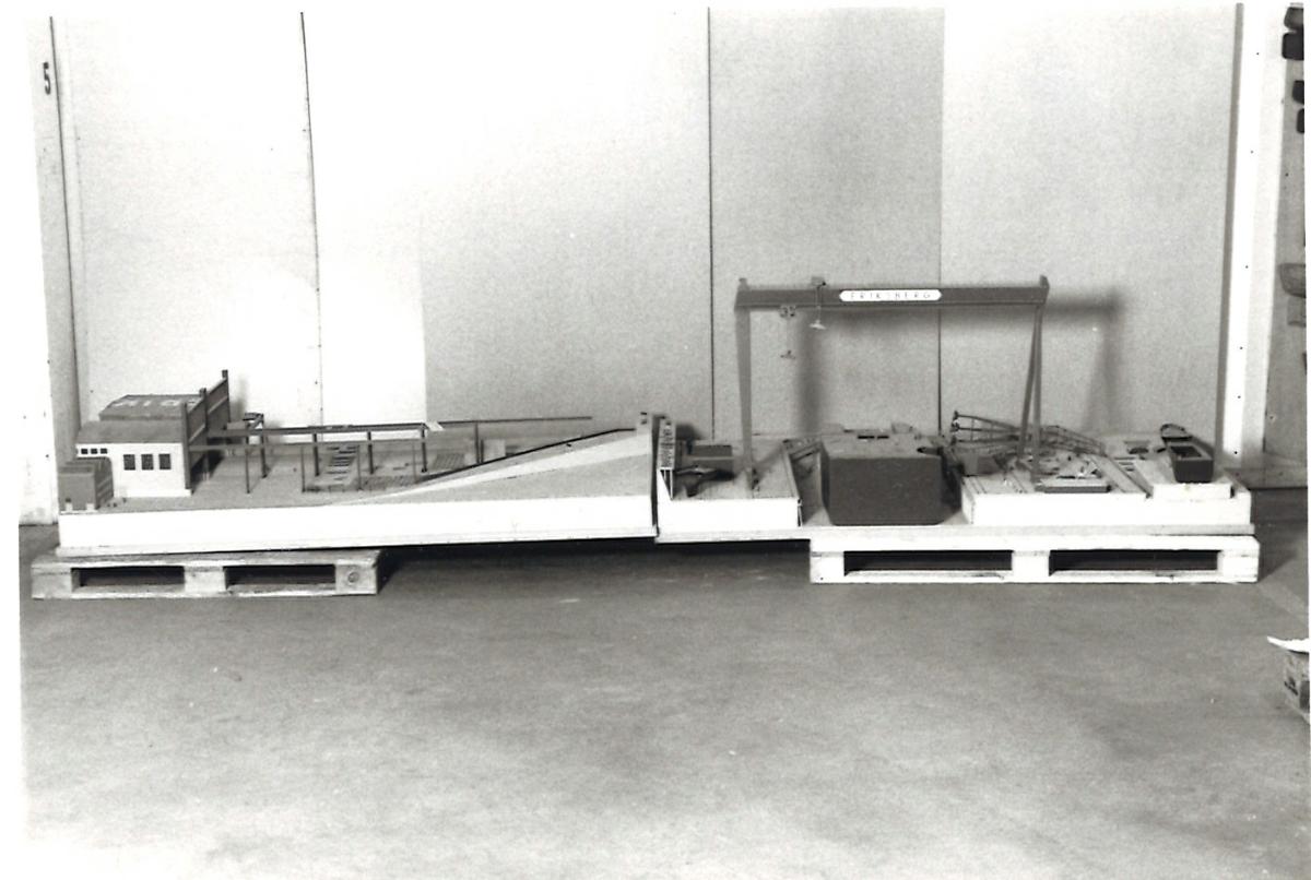 Varvsmodell: Torrdocka där sektionen av akterskeppet skall ligga med bockkranen över dockan, stapelbädd nr. 6, matsalar, omklädningsrum, mallförråd m.m. är beläget, kontorsbyggnad. Lösa delar: Bockkran, aktersektion, 3 lyftkranar, 2 lastbilar, 4 människor, 2 förmanscyklar, 10 långtradarsläp, 1 tankbilssläp, 5 containervagnar.