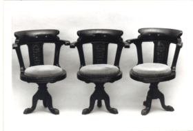 Ett ben som förgrenas i 3 svängda fötter. Fötterna har hål för att man ska kunna skruva fast dom i golvet. Cirkelrund vridbar sits med löstagbar dyna (original?) i röd-vit-randig plysch. Sitsen är fastskruvad i benet med en mutter och går att lyfta av. Halvhögt ryggstöd med armstöd. Utskuren växtdekor på ryggstödets fram- och baksida. Benet i gjutjärn, sits och ryggstöd i svartlackerat trä.