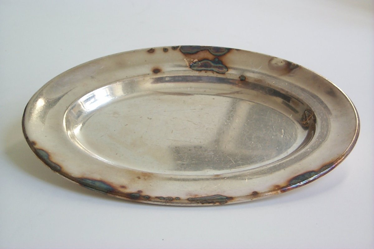 Ovalt uppläggningsfat med plan botten, låg kant som övergår i ett svagt lutande brett brätte. Dekorerad med stansad bolagsflagga.