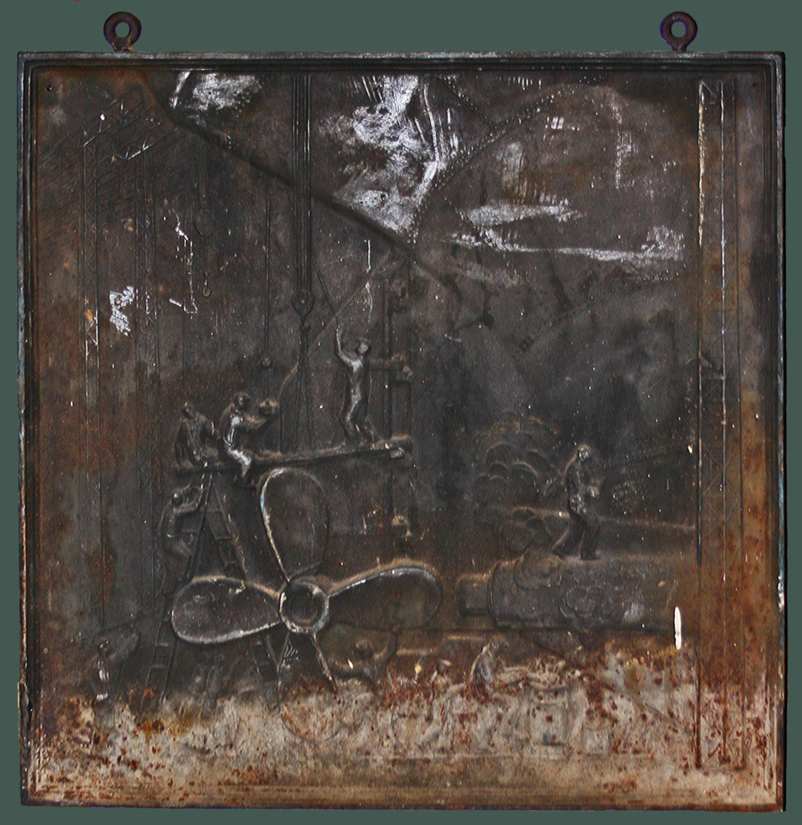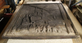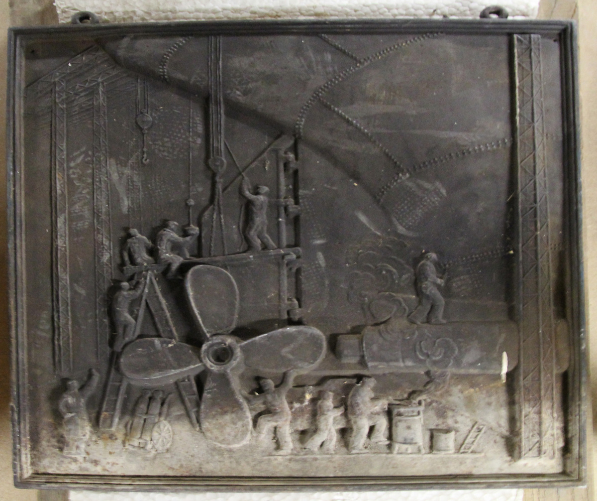 Dubbelsidig relief med motiv på båda sidorna. Ena sidan föreställer montering av propellern och den andra sidan visar sjösätting och dop av KUNGSHOLM.