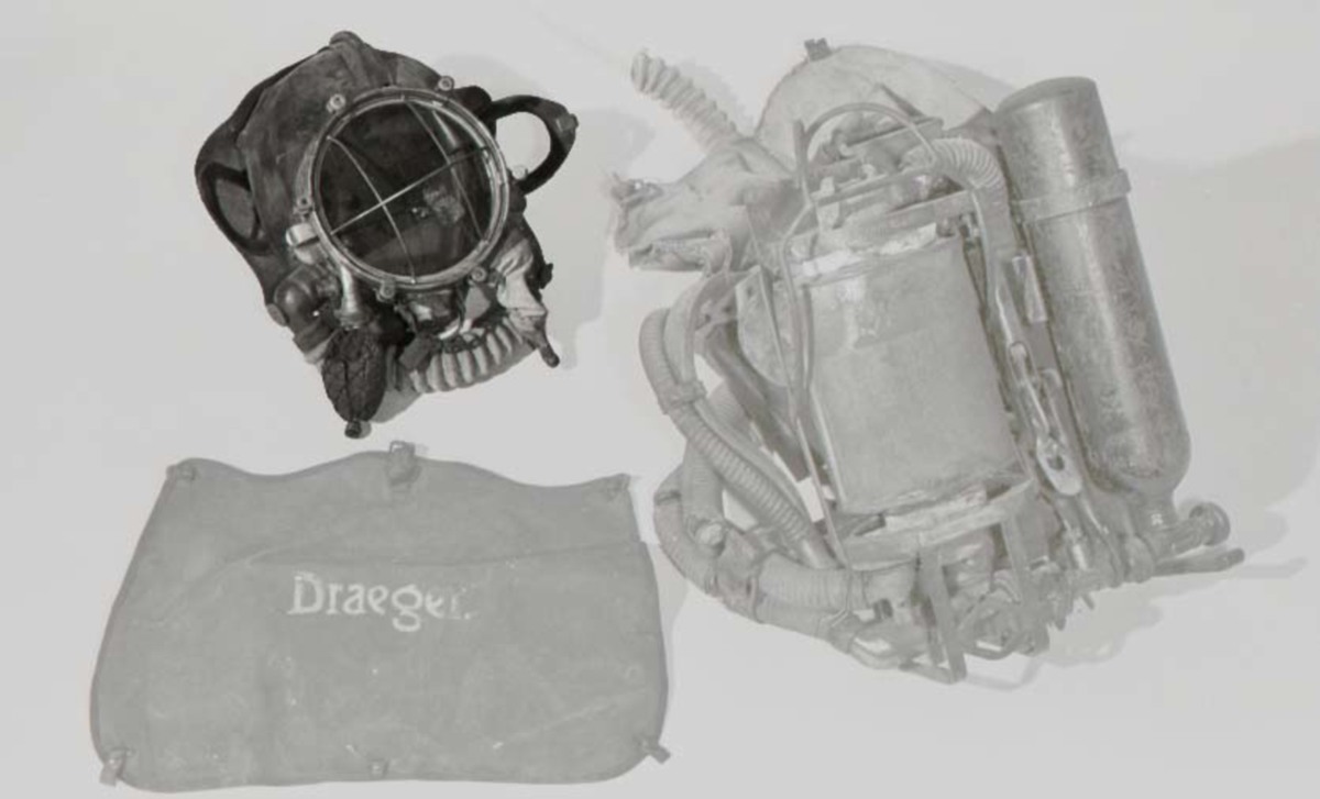 Dykarhjälm, läderhuva med rund mässingsinfattning, med skruvar, för glas med galler framför. På sidorna ventiler med en slang under glaset. Mitt under glaset en öppning med lock, på båda sidor om denna tygpåsar.