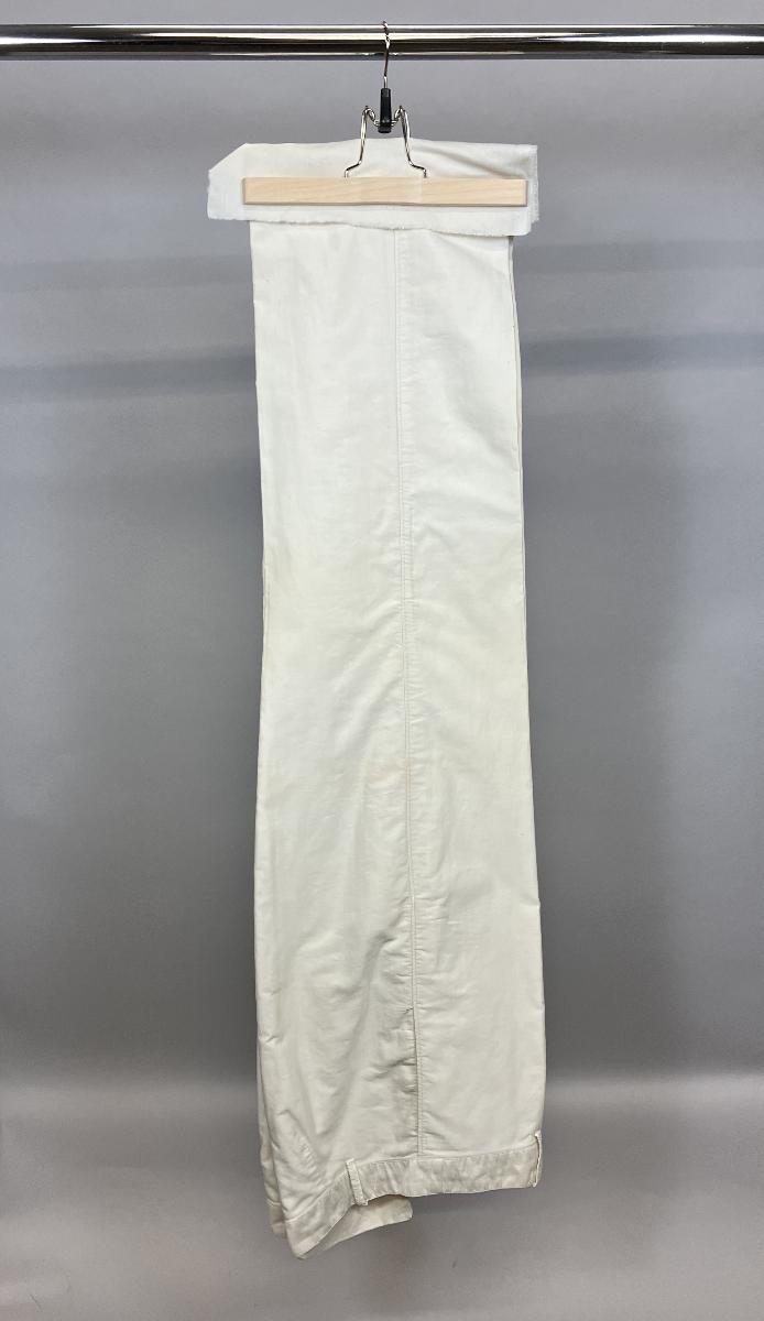 Vita sjökaptensbyxor i bomullstyg med slag och konsthartsknappar i gylf och linning. För sommarbruk.