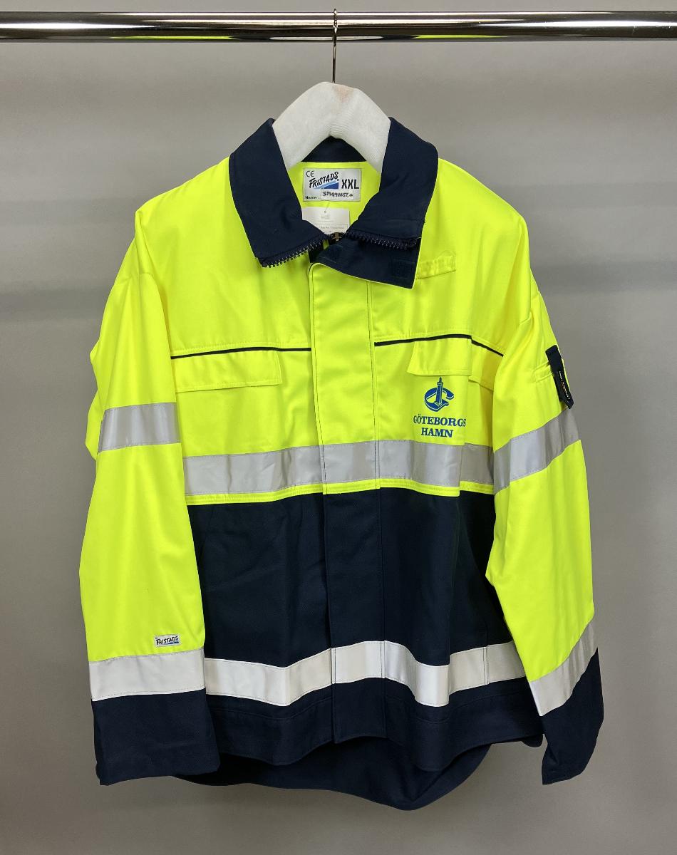Göteborgs Hamns skyddsjacka av 2010 års sommarmodell nr 439/1. Jackan har mörkblå underdel och lysgul överdel och är försedd med två horisontella reflexband runt kroppen och två runt varje arm. På vänster framsida samt på ryggen sitter hamnens logga. Jackan är oanvänd. Firmaetiketterna finns kvar.