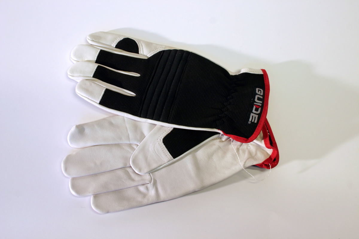 Arbetshandske av beige getläder med ovansida av svart strechtextil och resår vid handleden.