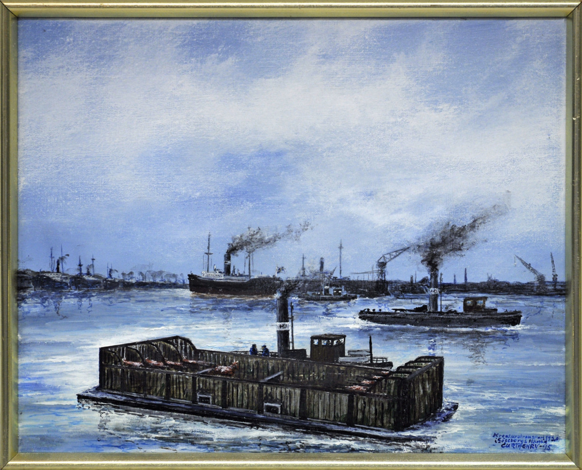Oljemålning, kreaturstransport 1920 i Göteborgs hamn