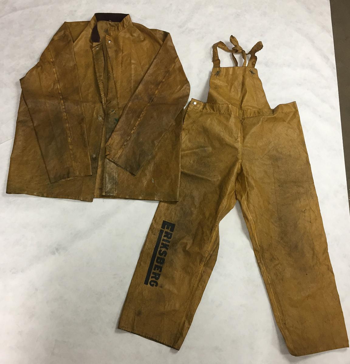 a= regnjacka, gul ståkrage fodrad med brun manchester, knäppning fram med tryckknappar i metall. b= regnbyxor, gula, snickarbyxmodell, 1 tryckknapp i metall i midjan, metallspännen fram och gummiband bak i hängslena.