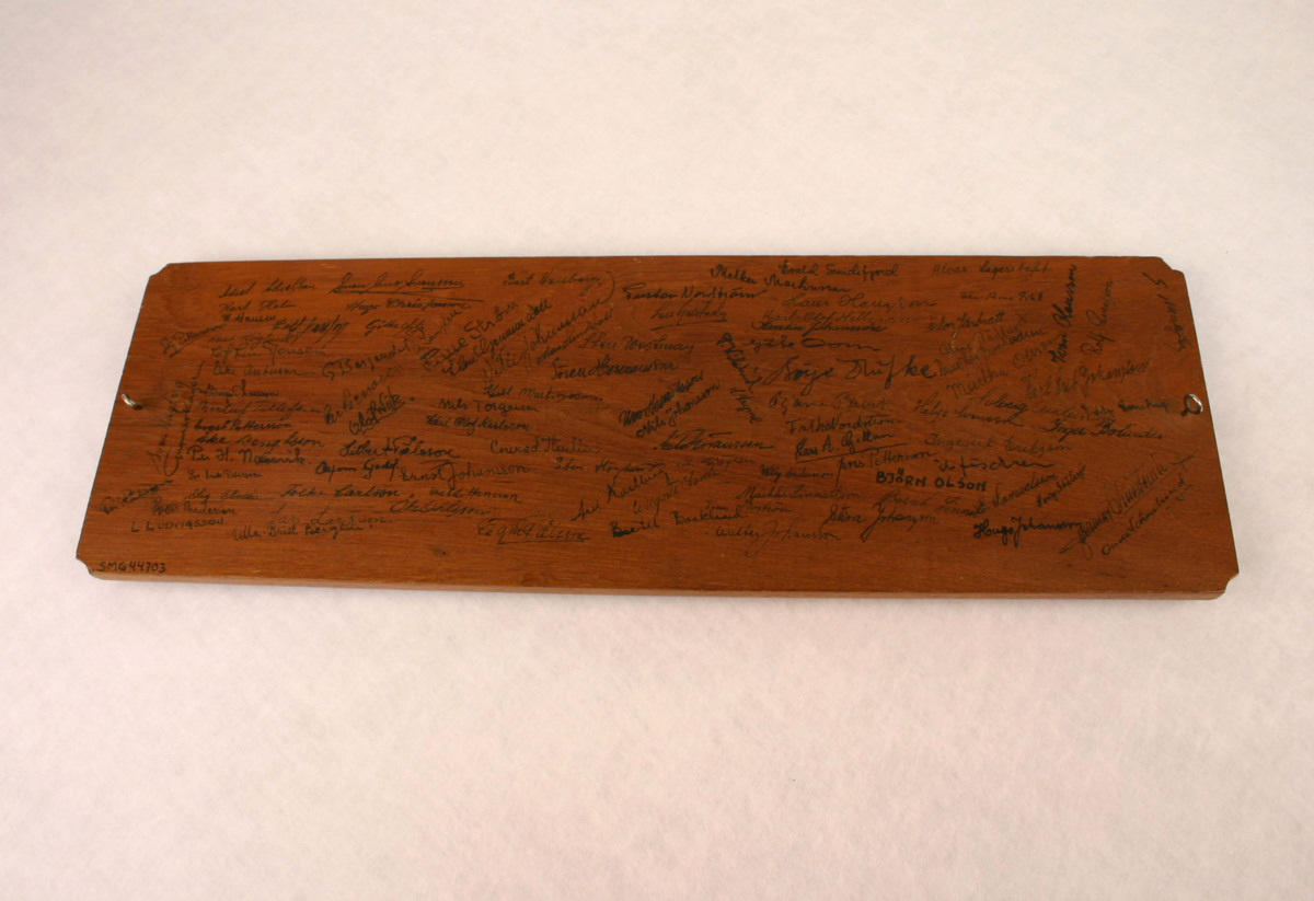 Tillverkad i tre sorters träslag. Baksidan är täckt av namnteckningar i svart.