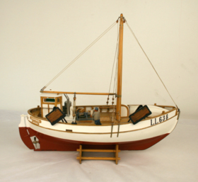 Fiskebåt med manskap. Målad i rött och vitt. Löst stativ.