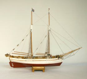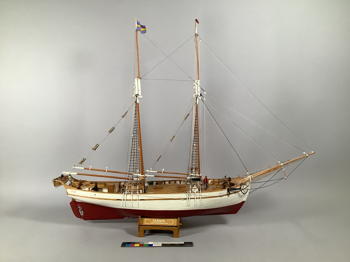 Modellskepp med manskap. Målad i rött och vitt. Står på ett löst stativ.