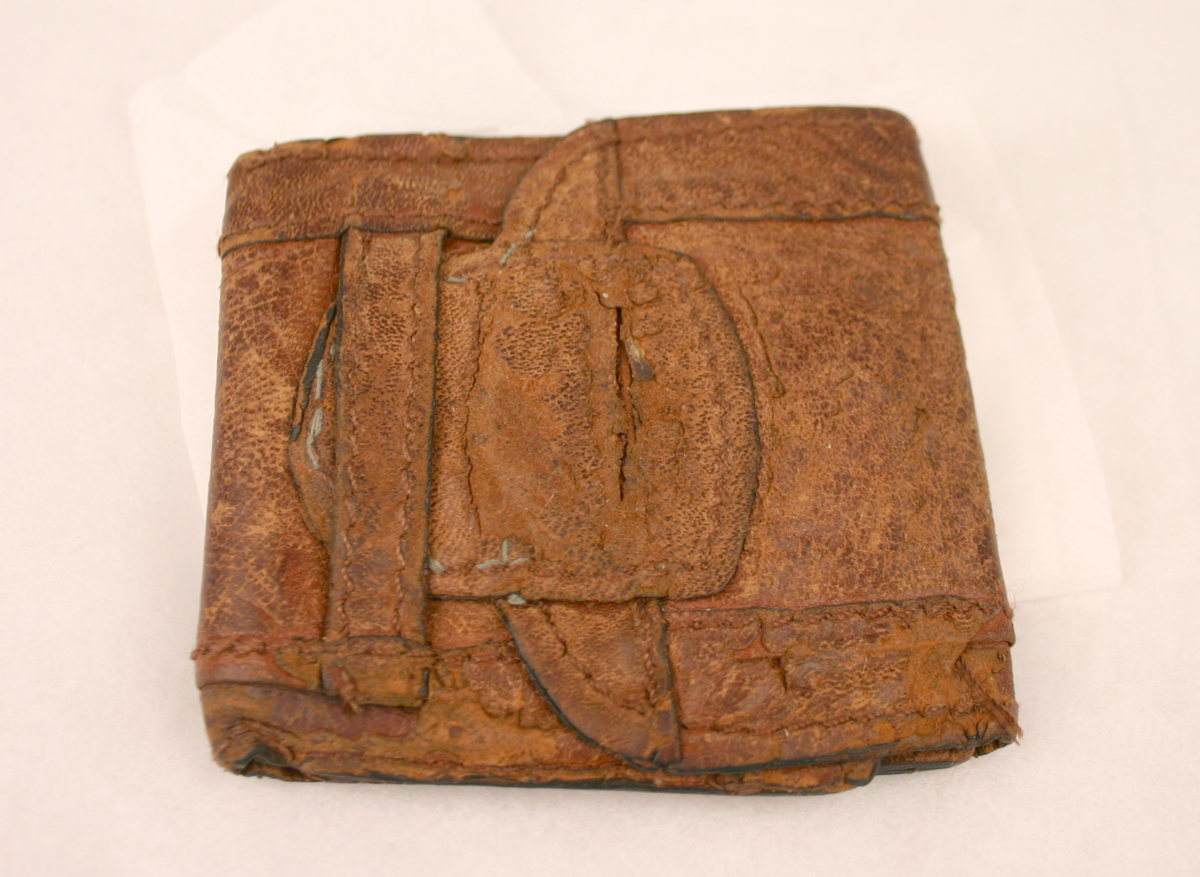 Nött plånbok i brunt sytt skinn med två fack för sedlar, ett fack för visitkort och ett fack för mynt som går att stänga med lock och tryckknapp. Plånboken innehåller ett svartvit kort föreställande ett barn. Troligtvis är barnet på bilden ett av Härolds barn eller barnbarn. (Kortet förvaras i arkiv).