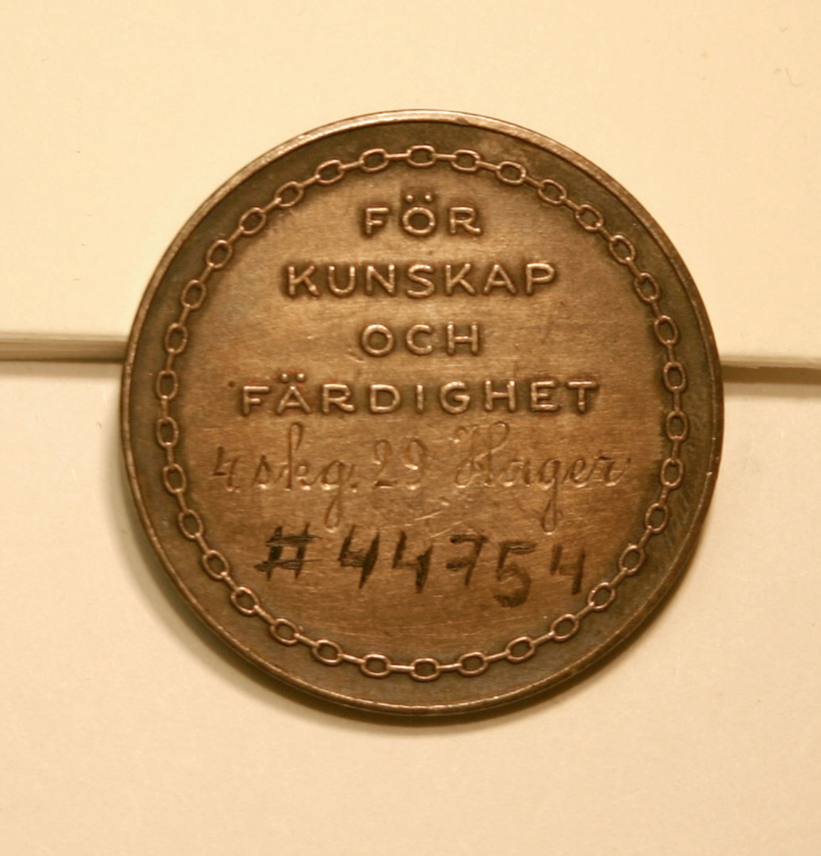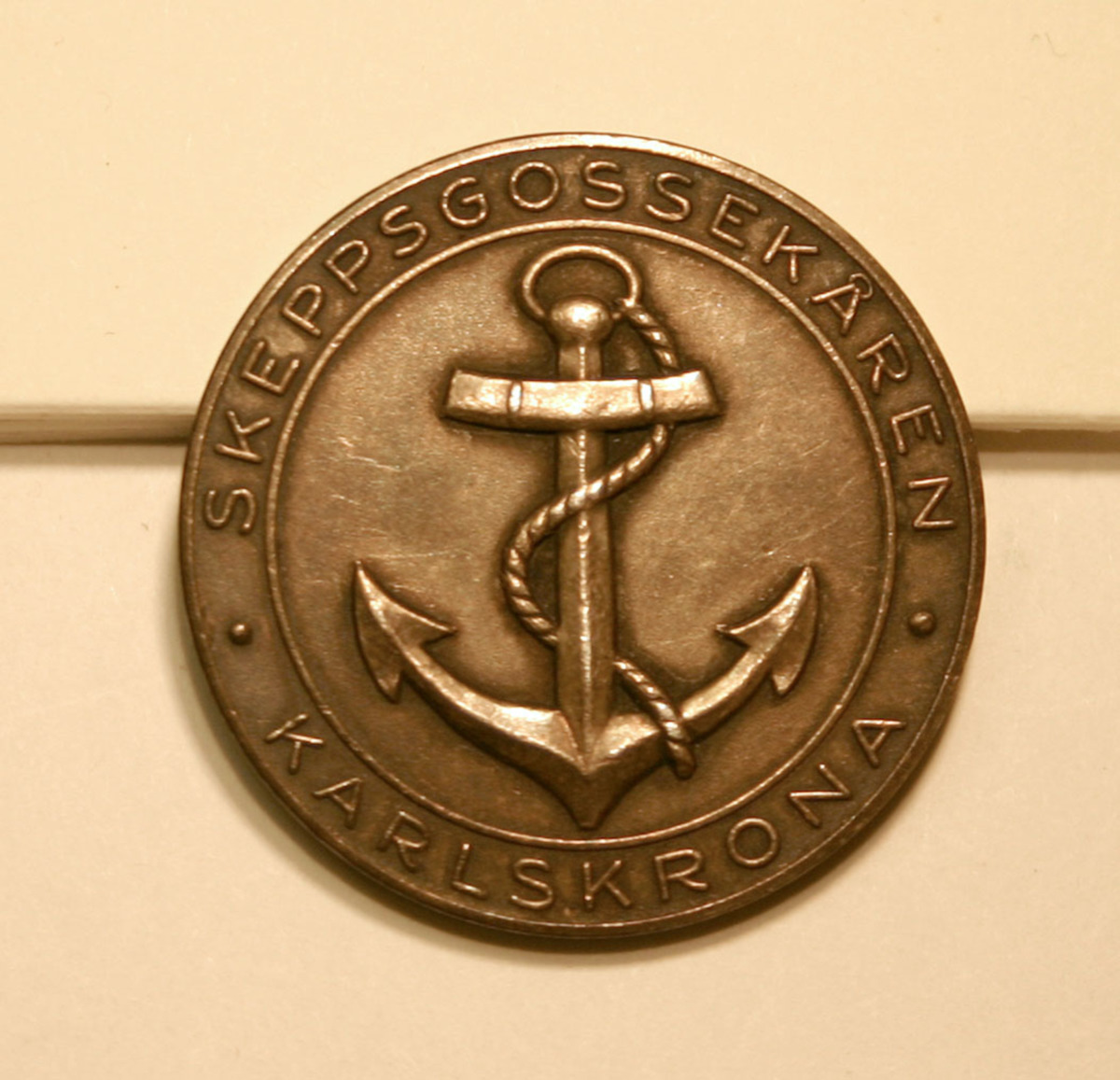 Medalj i silver med Skeppsgossekårens emblem, ankare med tross.