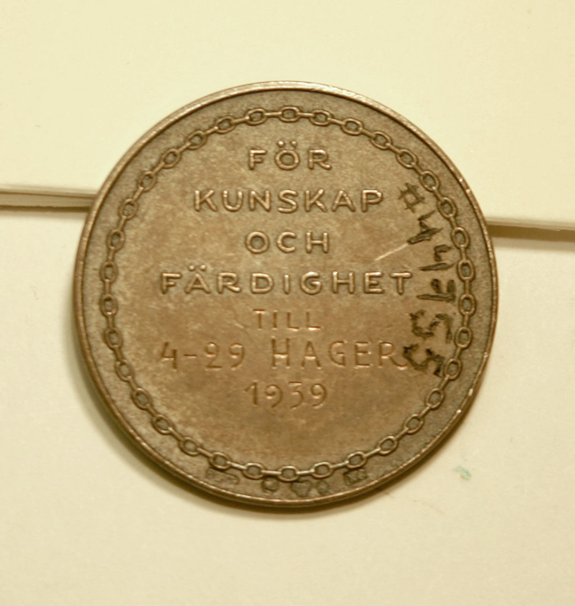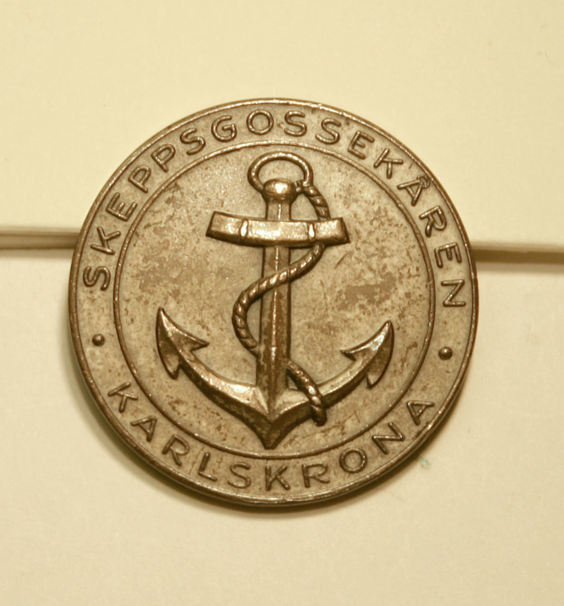 Medalj i försilvrad koppar med Skeppsgossekårens emblem, ankare med tross.
