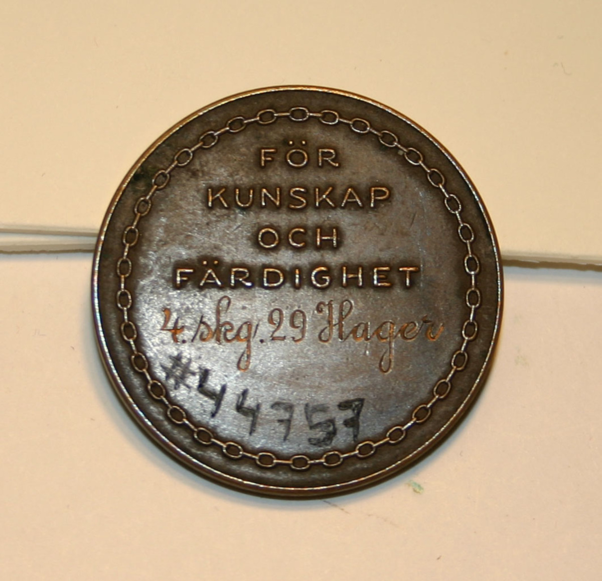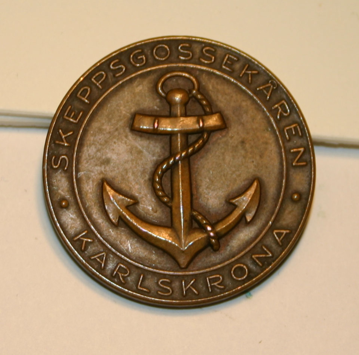 Medalj i brons med Skeppsgossekårens emblem, ankare med tross.
