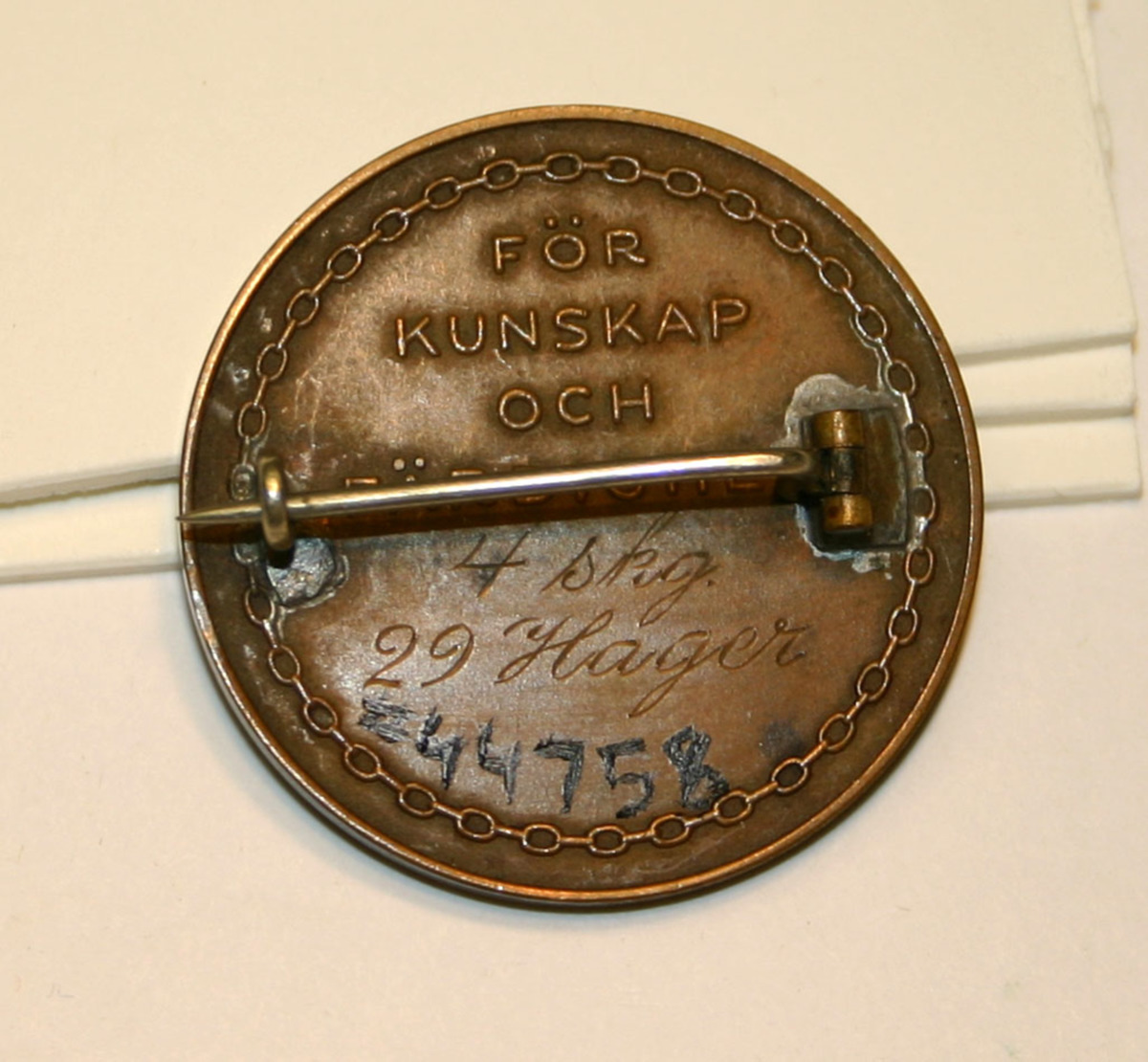 Medalj i brons med Skeppsgossekårens emblem, ankare med tross. Med lödd nål för fästning.