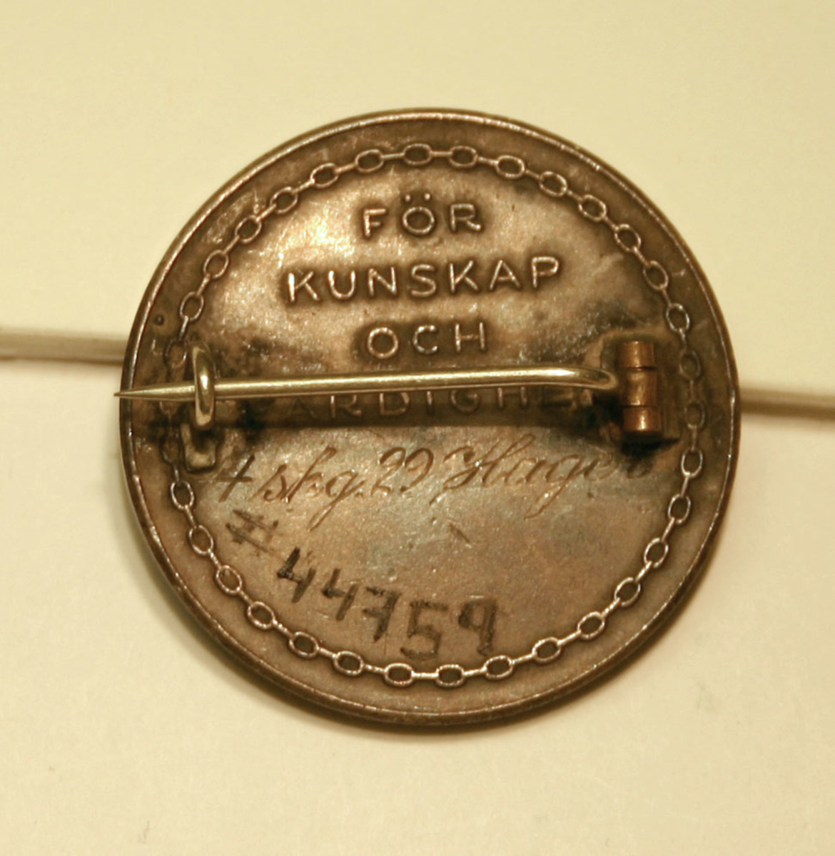 Medalj isilver med Skeppsgossekårens emblem, ankare med tross. Med lödd nål för fästning.