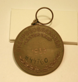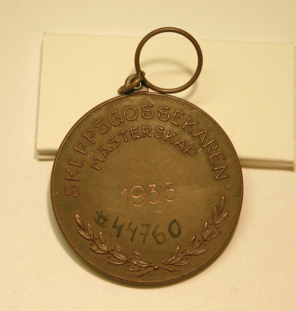 Medalj i brons med Skeppsgossekårens emblem, ankare med tross, och tre kronor. Ring för fästning i sidenband.