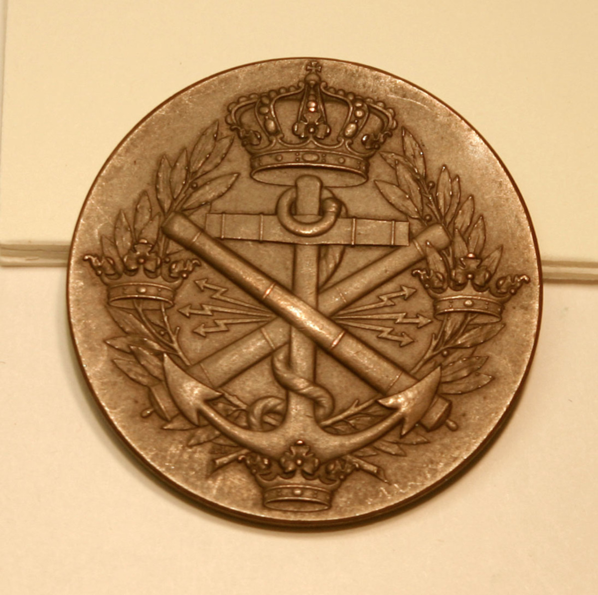 Medalj i brons med emblem, ankare med tross och två korsade kanoner och blixtar krönt med en krona. Runt dessa en lagerkrans och tre kronor.