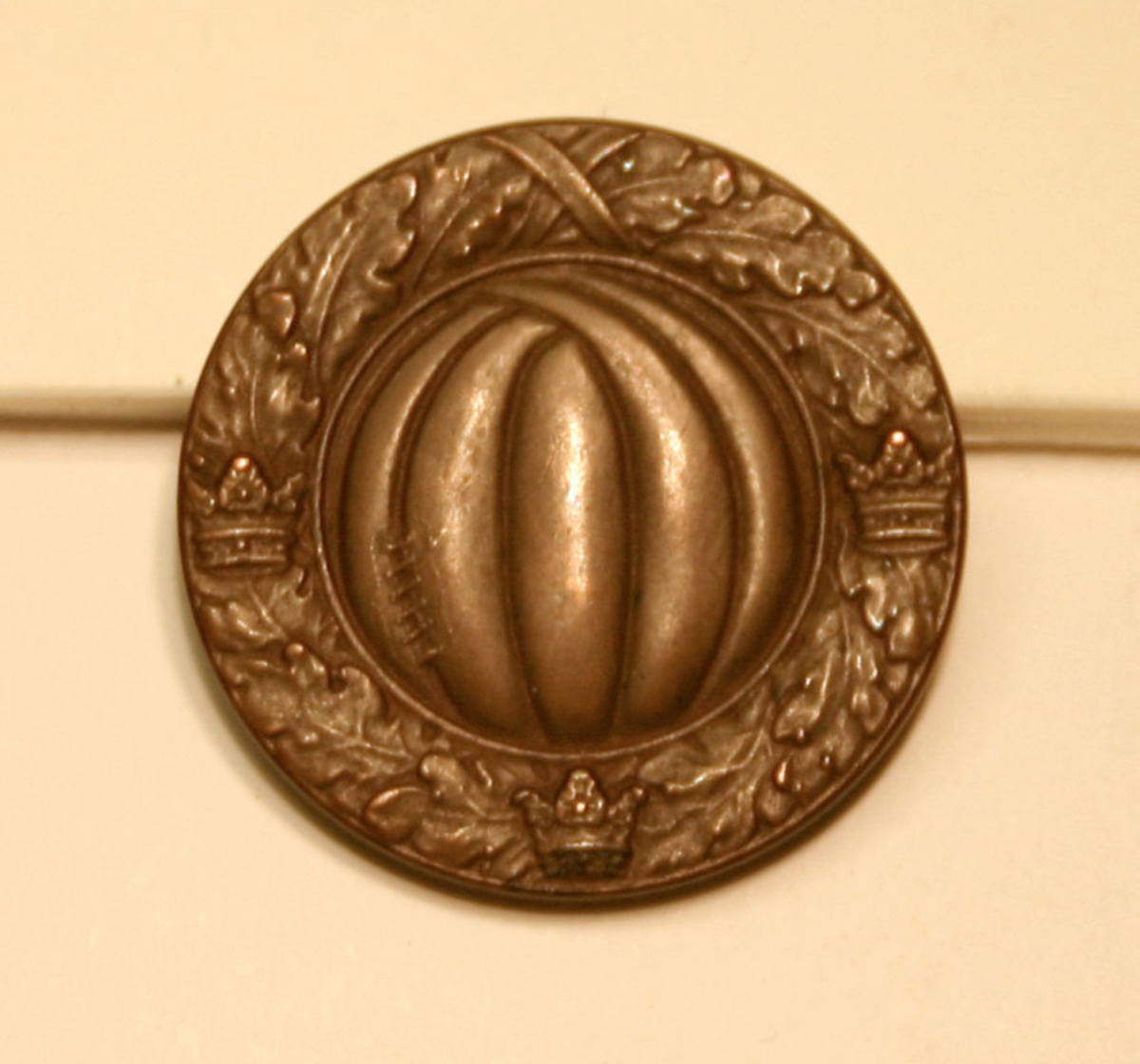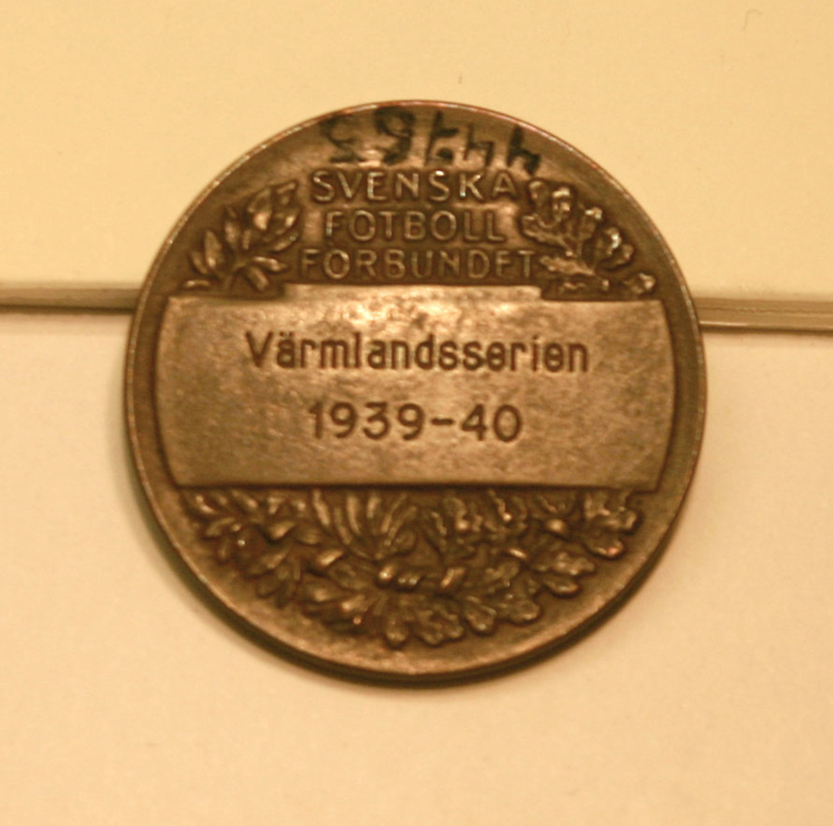 Medalj i brons med emblem, lagerkrans, tre kronor och en läderfotboll.