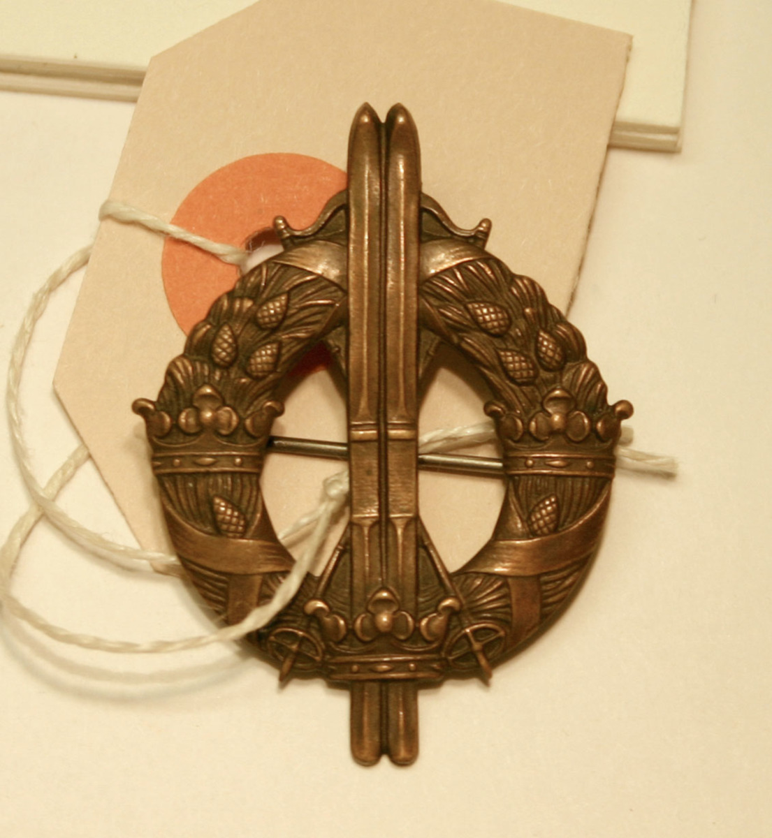 Genombruten medalj i brons med emblem, skidor med stavar, lagerkrans och tre kronor.