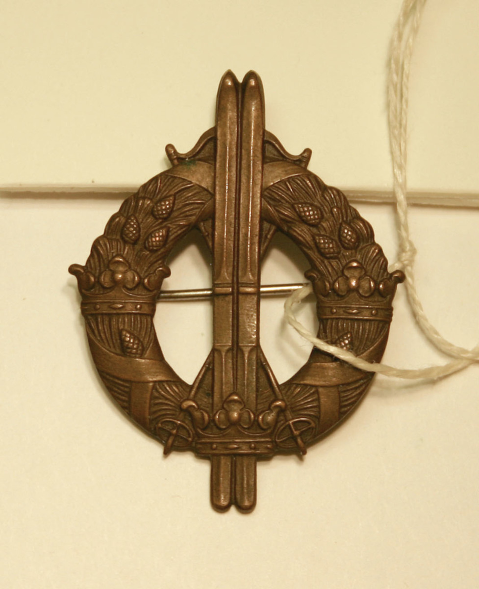 Genombruten medalj i brons med emblem, skidor med stavar, lagerkrans och tre kronor.