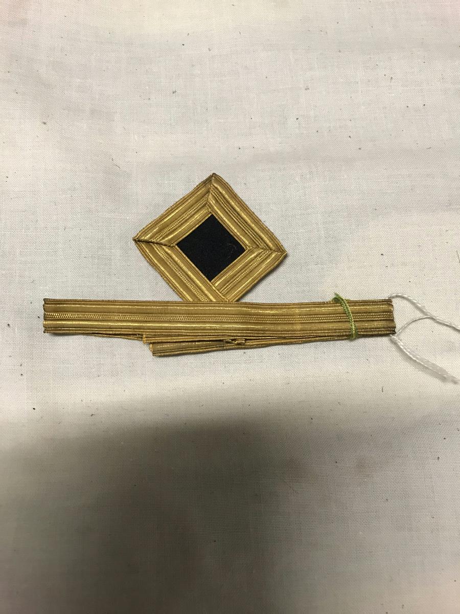 Oanvänd galon i guld för tre band och fyrkantig ögla för axelklaff. Fyrkanten färdigsydd på en förstärkt yllebit.