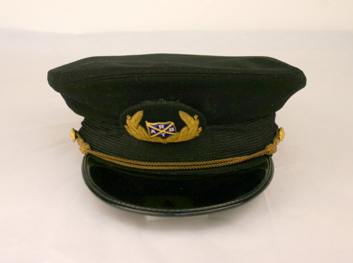 Skärmmössa för uniform med svart utspännd kulle och svart lackskärm. Framtill är påsytt ett mössmärke med en guldfärgad lagerkrans omslutande ett emaljerat metallmärke föreställande RABTs rederiflagga.