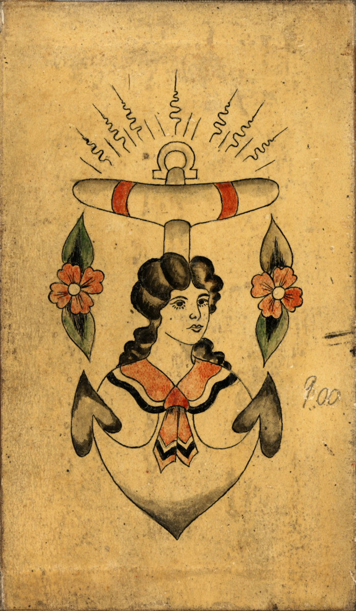 Fjorton stycken färglagda tatueringsförlagort. Dessa förlagor är uppklistrade på väv bredvid varandra så att de bildar ett 'dragspel'.