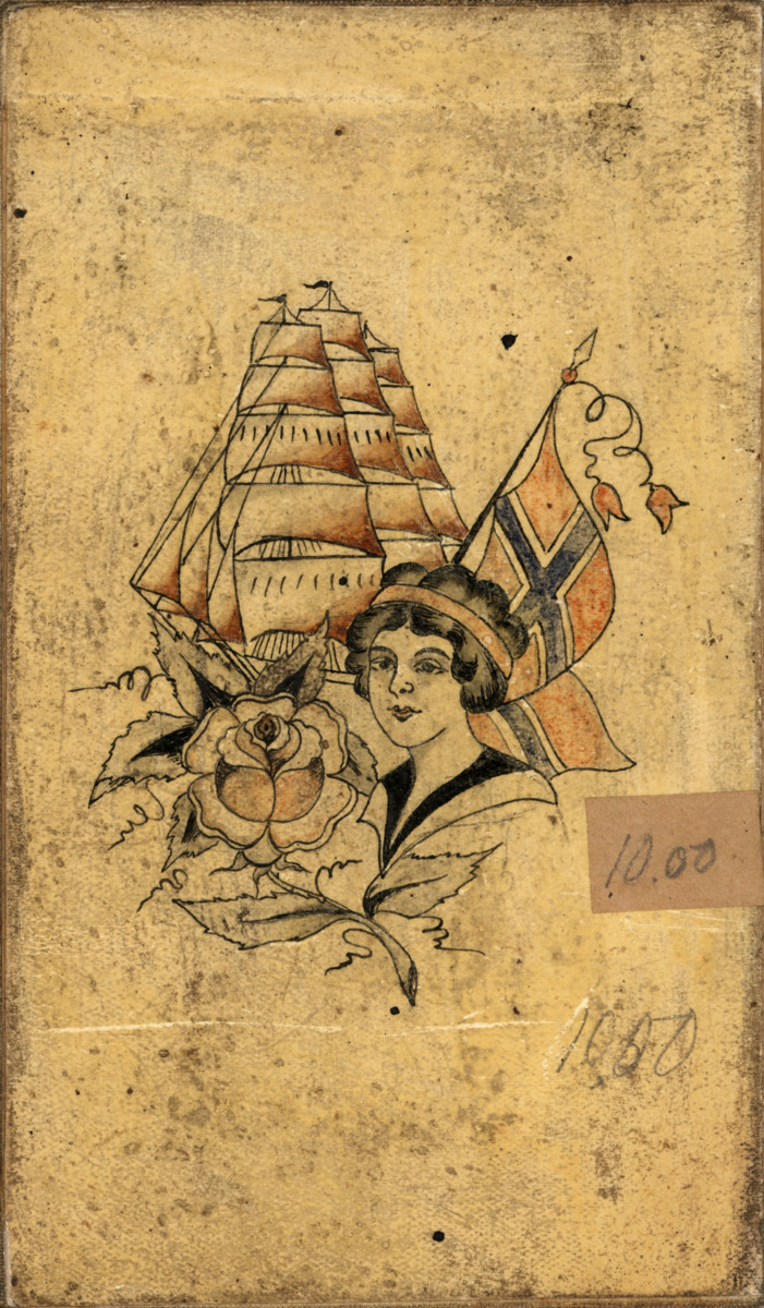 Fjorton stycken färglagda tatueringsförlagort. Dessa förlagor är uppklistrade på väv bredvid varandra så att de bildar ett 'dragspel'.