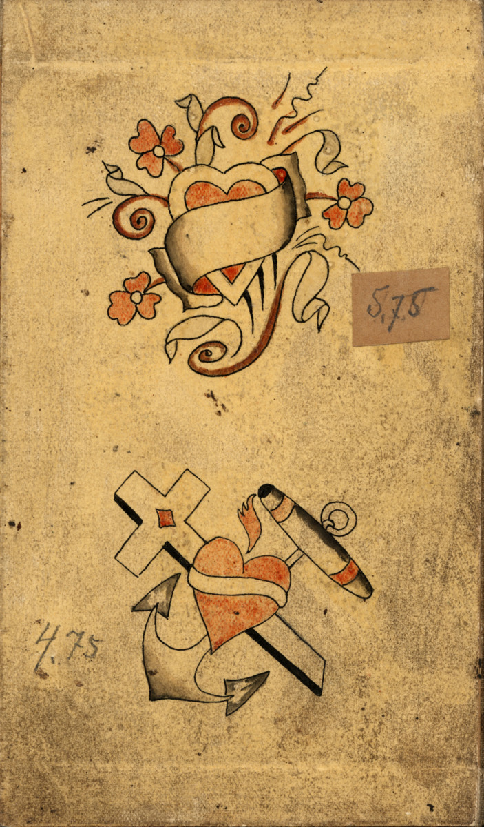 Fjorton stycken färglagda tatueringsförlagort. Dessa förlagor är uppklistrade på väv bredvid varandra så att de bildar ett 'dragspel'.