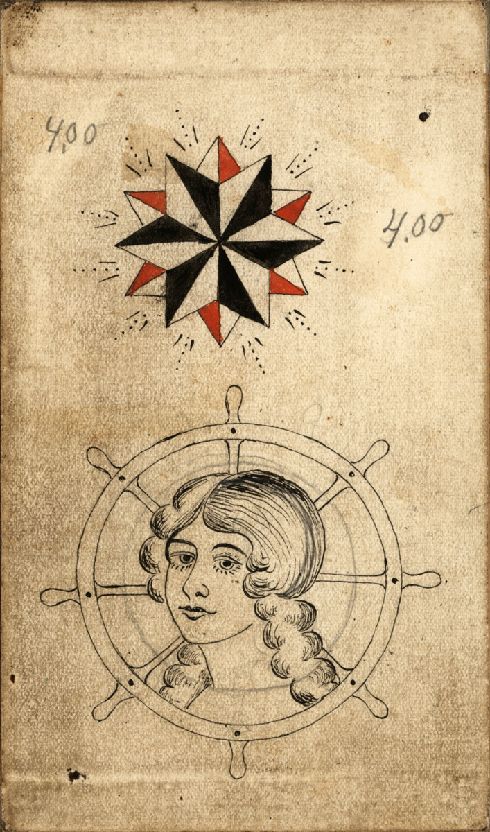 Fjorton stycken färglagda tatueringsförlagort. Dessa förlagor är uppklistrade på väv bredvid varandra så att de bildar ett 'dragspel'. Har tillhört Karl Gustafsson (”Tatuerar-Calle”)