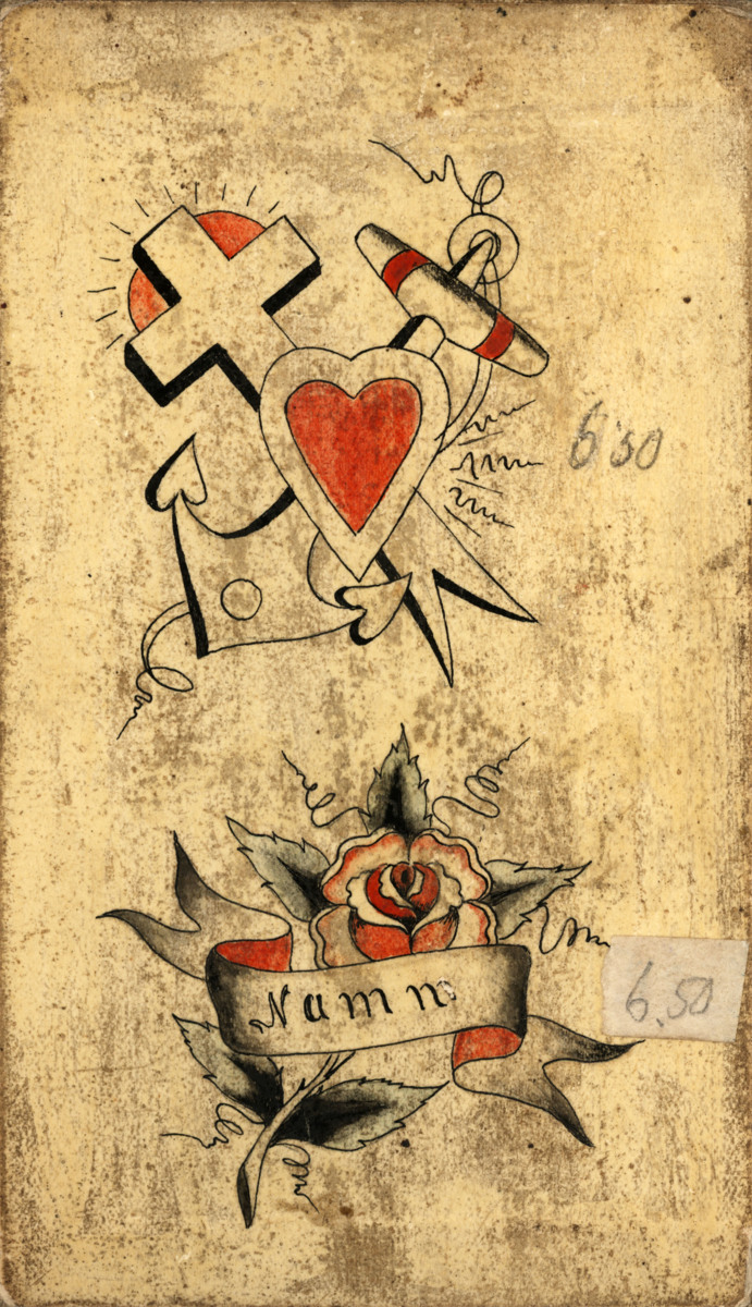 Fjorton stycken färglagda tatueringsförlagort. Dessa förlagor är uppklistrade på väv bredvid varandra så att de bildar ett 'dragspel'. Har tillhört Karl Gustafsson (”Tatuerar-Calle”)