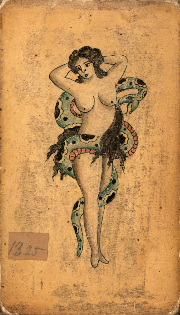Fjorton styckent färglagda och oftast lackade tatueringsförlagort. Dessa förlagor är uppklistrade på väv bredvid varandra så att de bildar ett 'dragspel'.