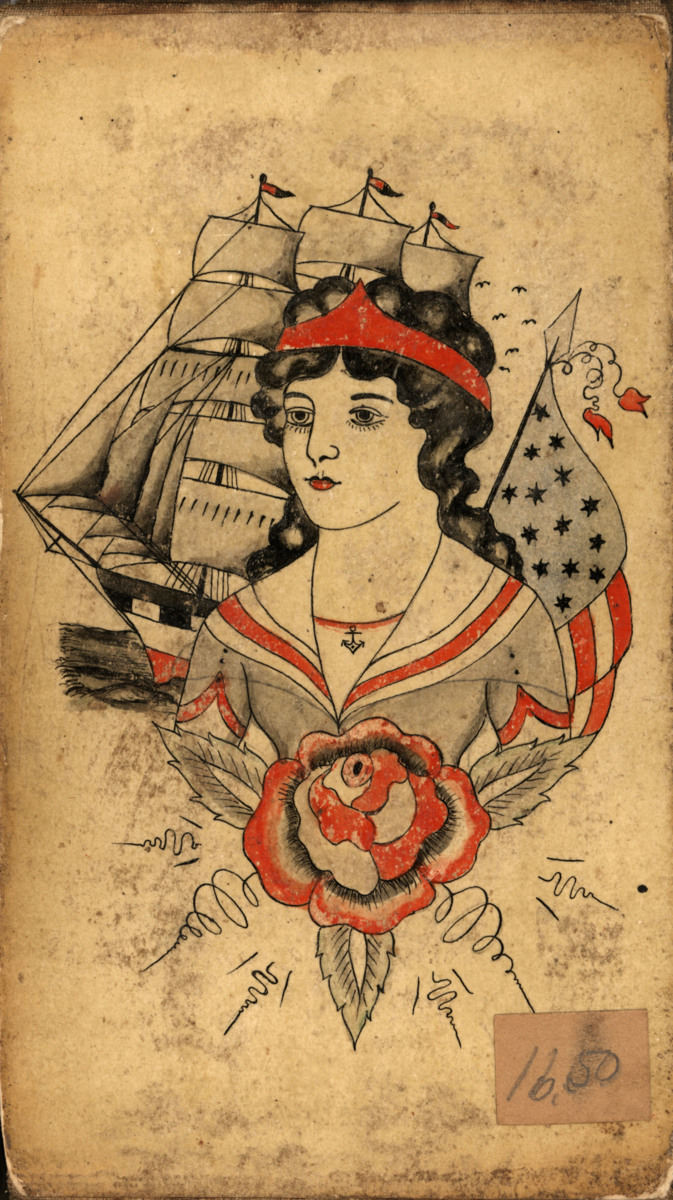 Fjorton styckent färglagda och oftast lackade tatueringsförlagort. Dessa förlagor är uppklistrade på väv bredvid varandra så att de bildar ett 'dragspel'.