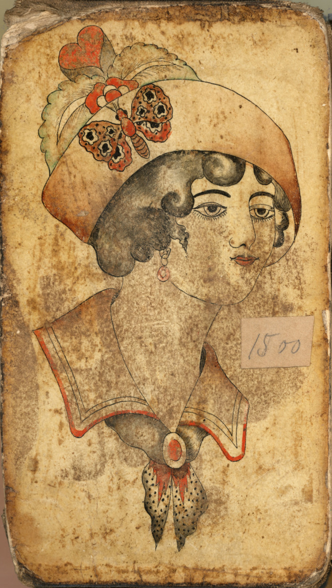 Fjorton styckent färglagda och oftast lackade tatueringsförlagort. Dessa förlagor är uppklistrade på väv bredvid varandra så att de bildar ett 'dragspel'.