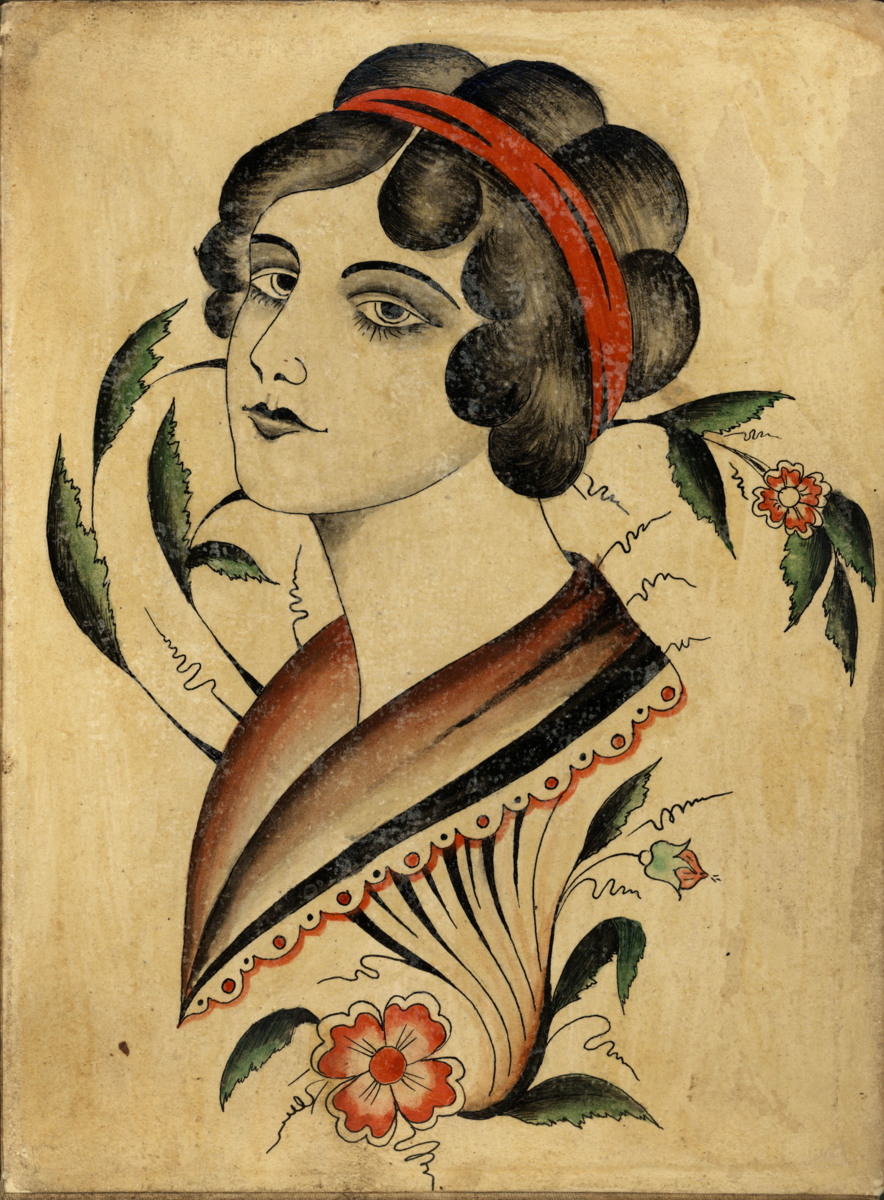 Tio stycken färglagda och oftast lackade tatueringsförlagort. Dessa förlagor är uppklistrade på väv bredvid varandra så att de bildar ett 'dragspel'.