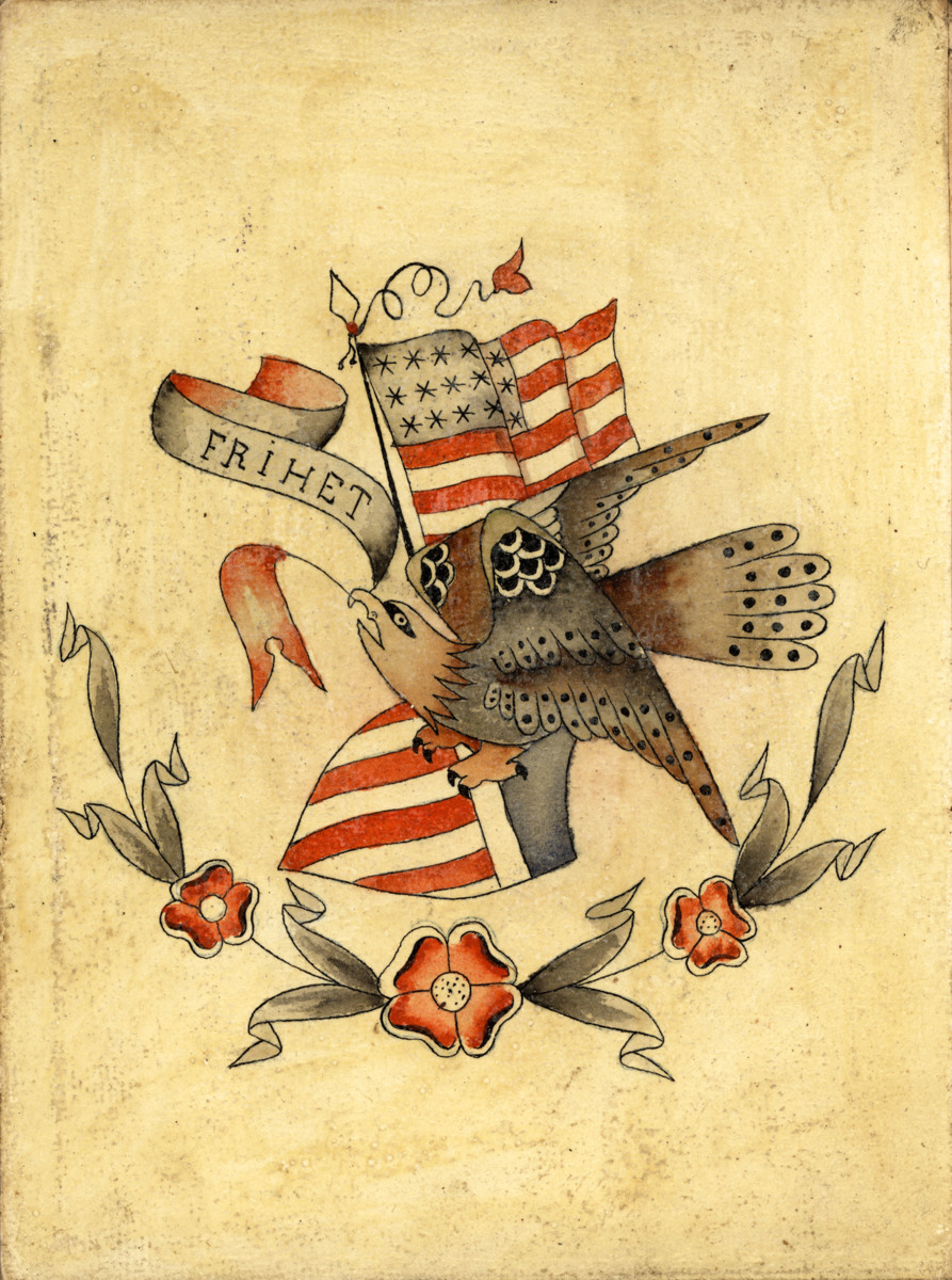 Tio stycken färglagda och oftast lackade tatueringsförlagort. Dessa förlagor är uppklistrade på väv bredvid varandra så att de bildar ett 'dragspel'.