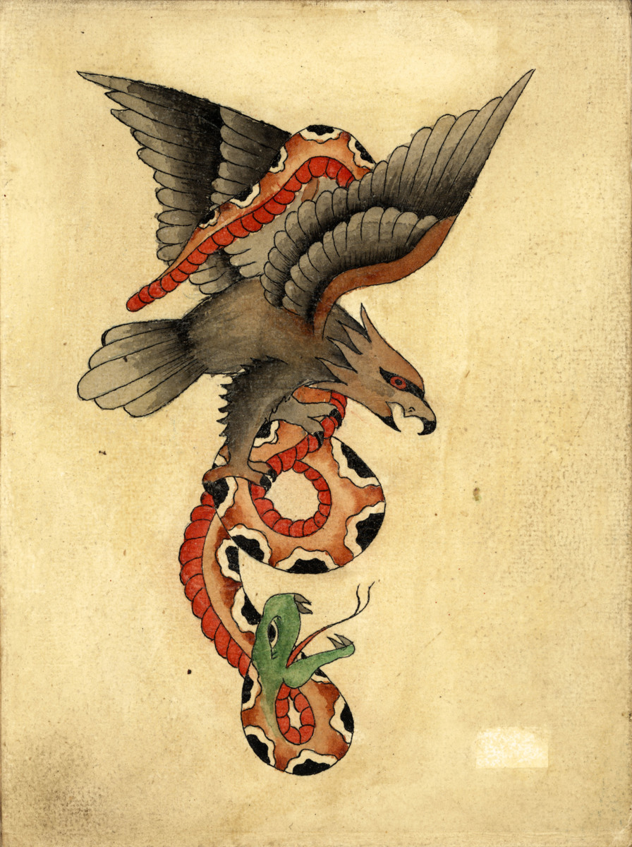 Tio stycken färglagda och oftast lackade tatueringsförlagort. Dessa förlagor är uppklistrade på väv bredvid varandra så att de bildar ett 'dragspel'.