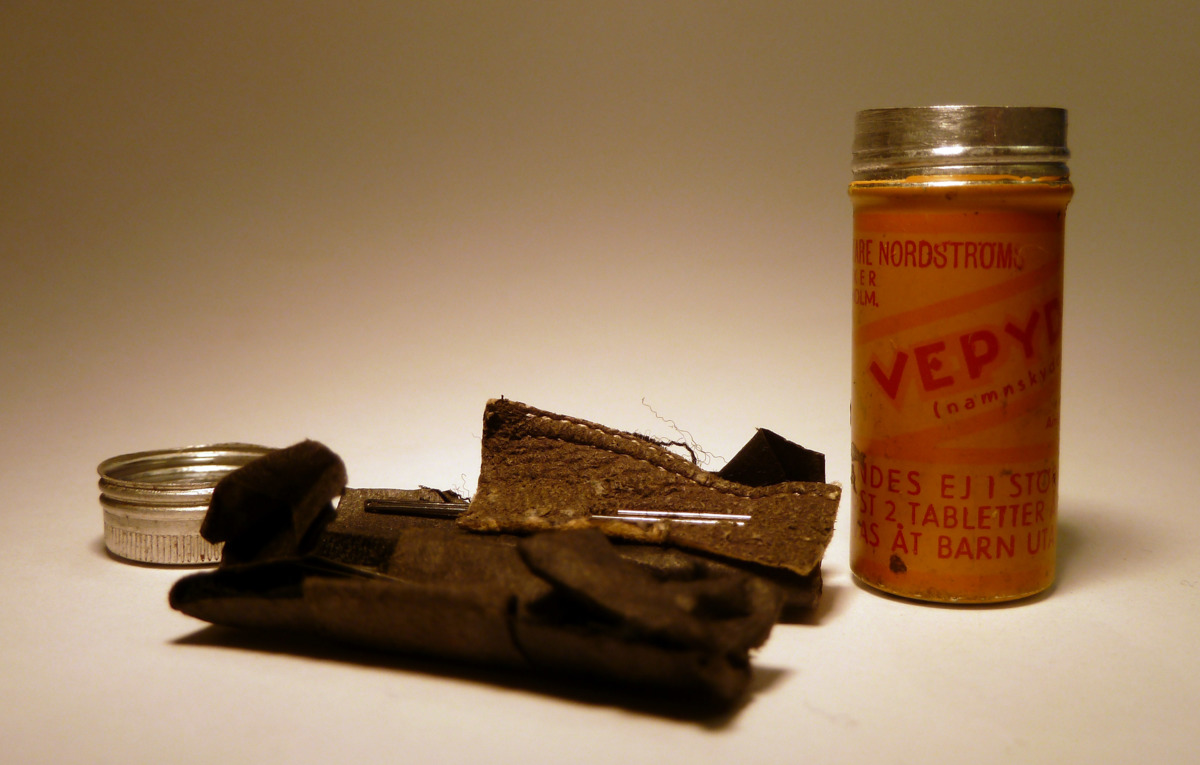 Flera nålar (synålar) som modifierats. Förvaras i en tubförpackning av lättmetall med skruvkork för Vepydon.