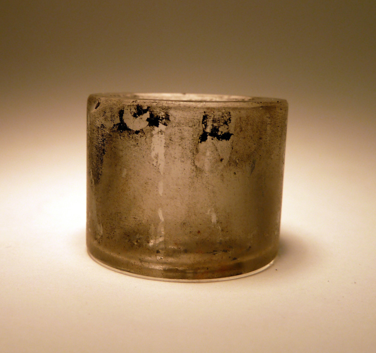 Liten glasbägare med tuschrester. Bägaren användes för att förvara tuschen i som tatueringsnålen doppades i vid tatuering.