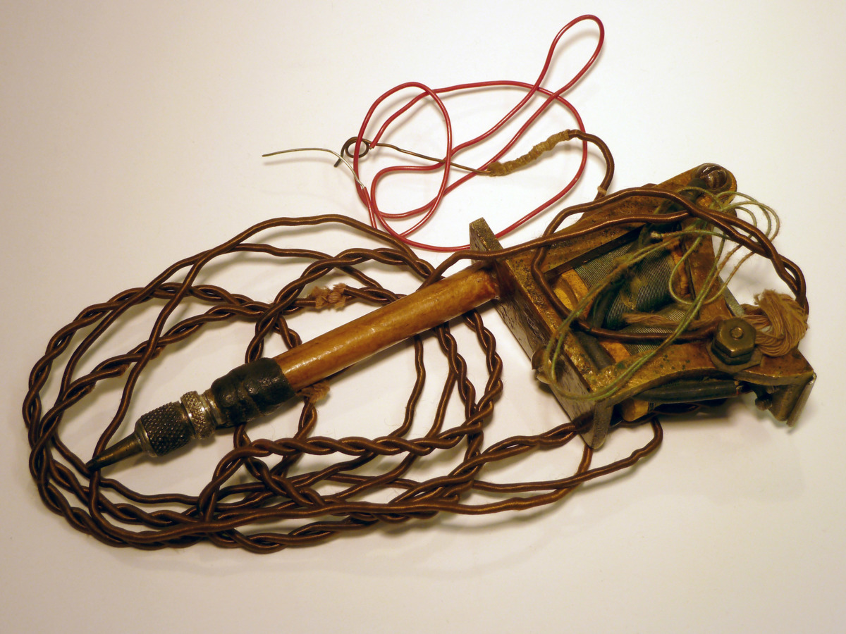 Hemmagjord tatueringsmaskin. Elektriska tatueringsnålar varmed tatueraren prickade in små färgdroppar i huden. Tatueringen överfördes först på ett smörpapper som i sin tur kalkerades av direkt på huden. Härefter vidtog den verkliga tatueringen.