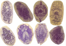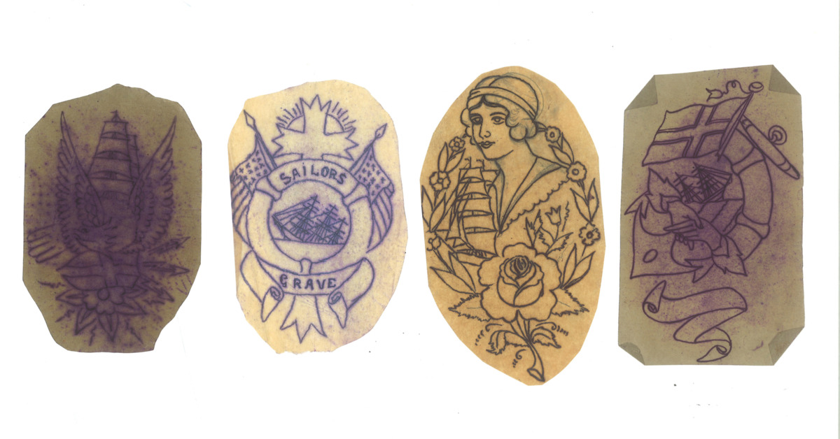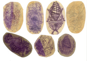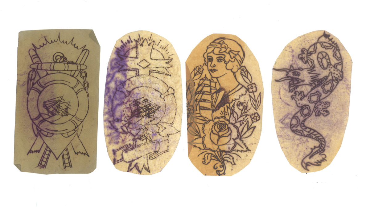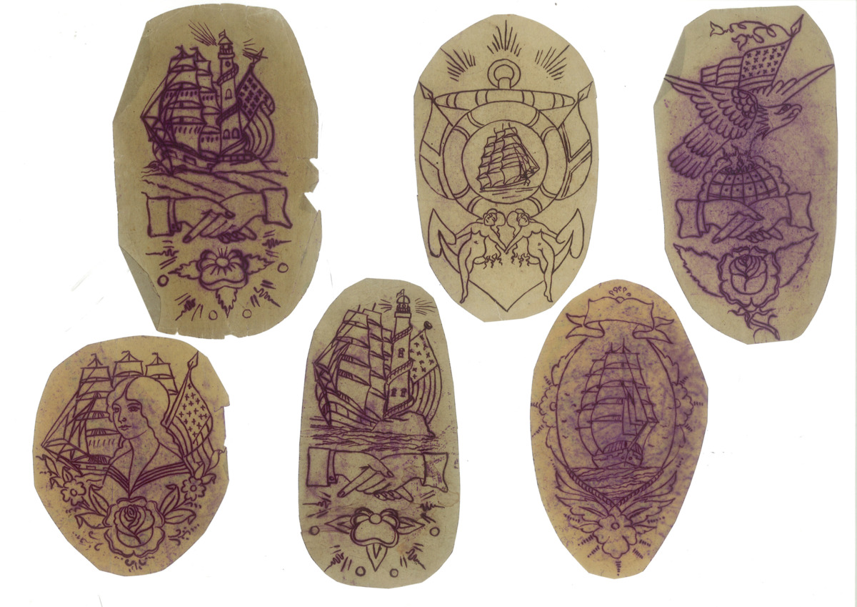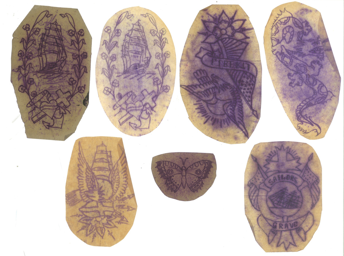 39 stycken mönsterblad i bläck. Har använts som förlaga till tatuering. Förvararades i fack nr 2 i en röd plånbok av läderimiterad textil. Tatueringen överfördes först på ett smörpapper som i sin tur kalkerades av direkt på huden. Härefter vidtog den verkliga tatueringen.